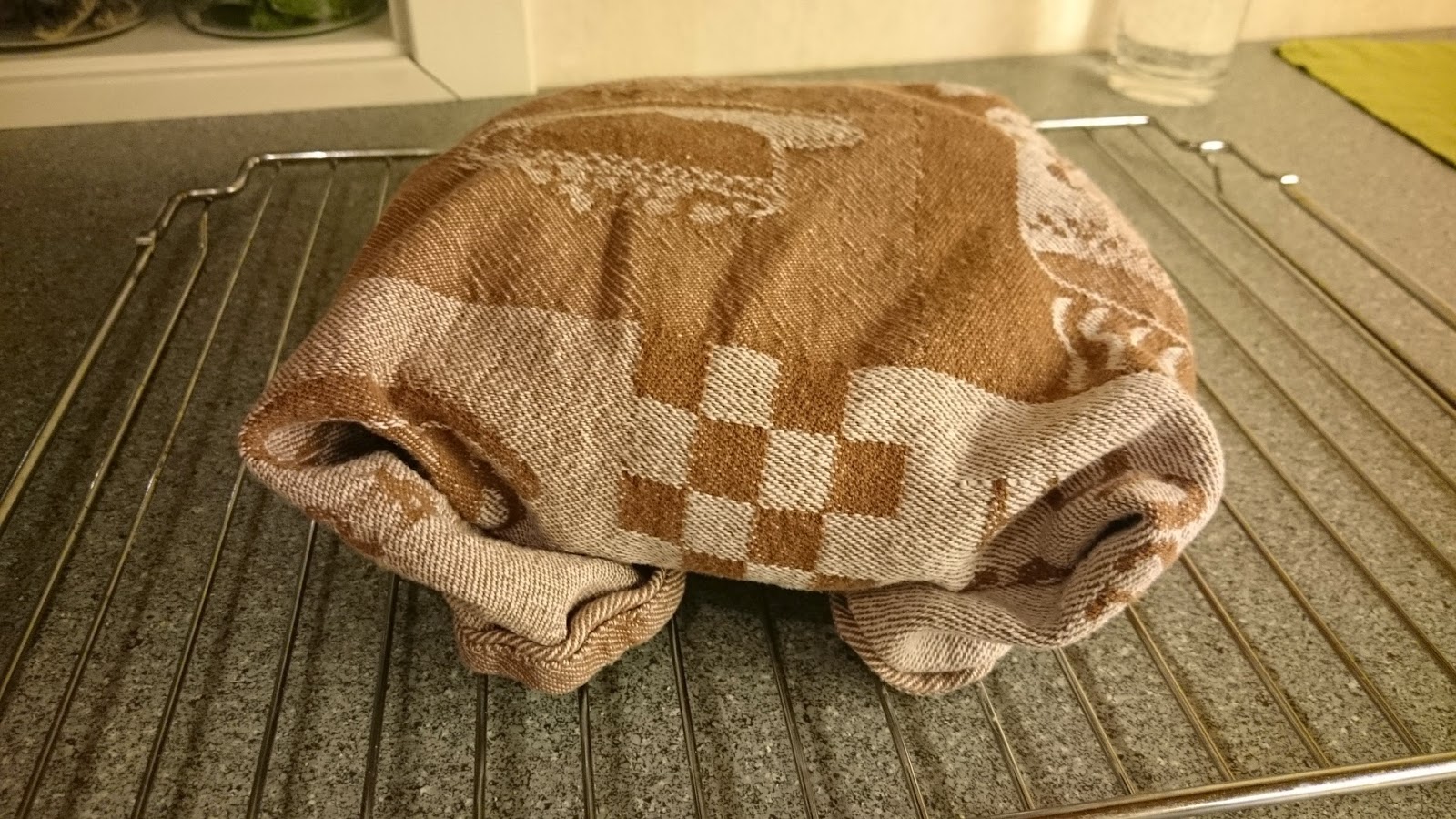Slik lar jeg deigen ligge og hvile til ovnen blir varm. Når ovnen er varm er også jerngryten varm. Mystisk nok...